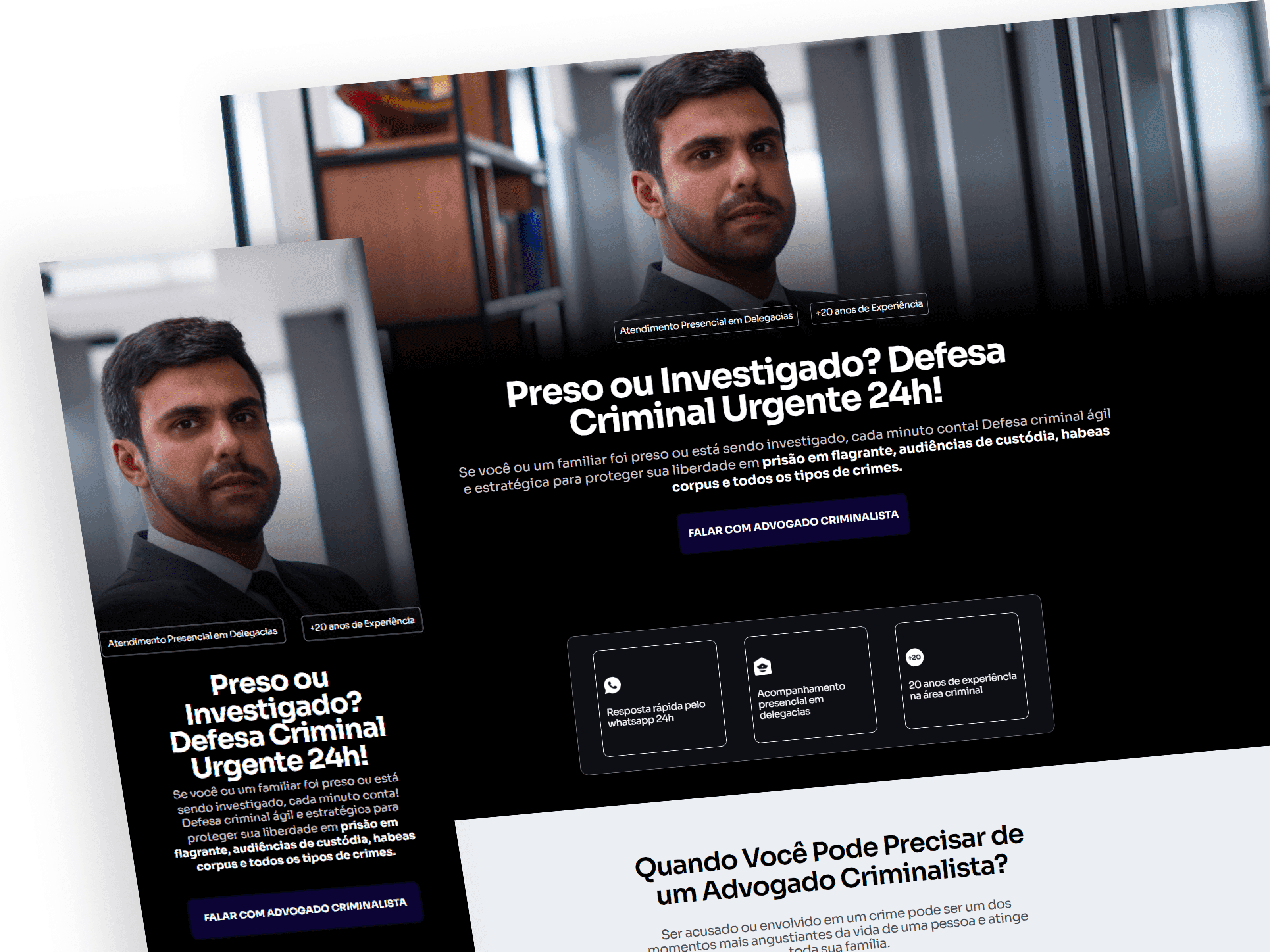 O grande desafio era construir uma identidade que fosse, ao mesmo tempo, imponente e moderna, sem recorrer aos clichês visuais do Direito. A missão era clara: destacar o advogado como alguém que luta com coragem, mas que age com profundo conhecimento técnico. Precisávamos representar visualmente a seriedade da atuação criminal sem parecer frio ou impessoal, e ainda construir uma marca memorável e singular.
