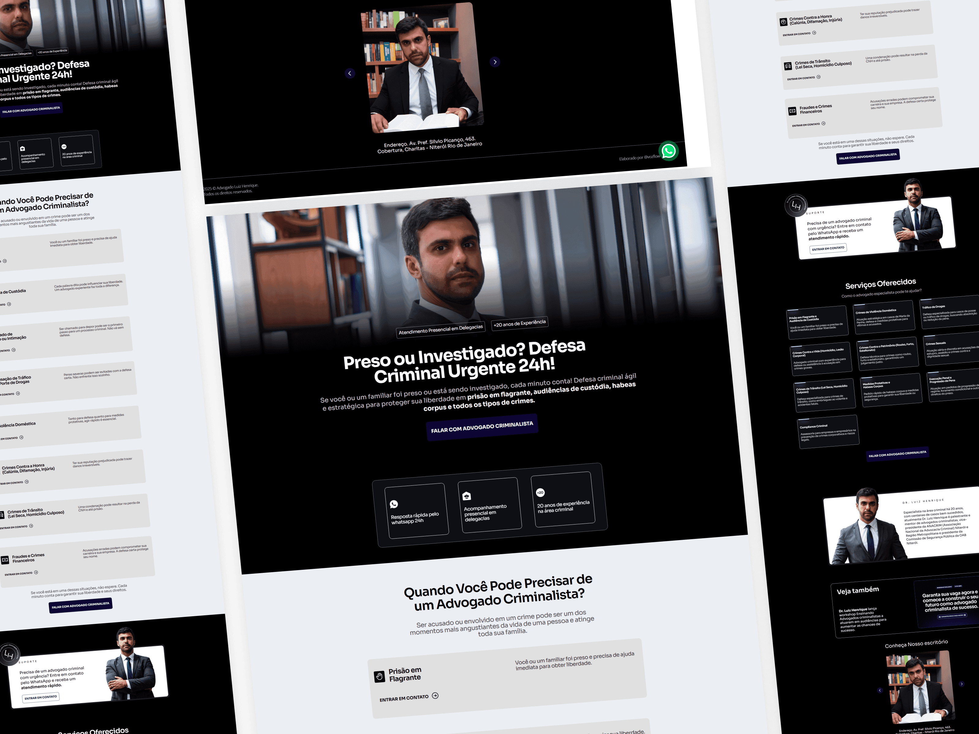 A identidade visual nasceu com base em três cores principais: azul-marinho, preto e prata, transmitindo solidez, seriedade e sofisticação. A logo, minimalista, une as iniciais “LH” em forma de um braço forte estilizado, revelando o equilíbrio entre técnica e força moral. As linhas retas, a postura ereta e o olhar penetrante nas imagens comunicam coragem e autoridade silenciosa. Tudo na composição visual remete à força do herói moderno: alguém que não se esconde, enfrenta batalhas reais e honra a responsabilidade de representar o outro diante da lei. O projeto é uma afirmação de que advocacia criminal também é missão e o Dr. Luiz Henrique está pronto para cumpri-la com excelência.
